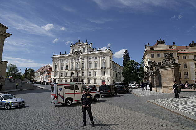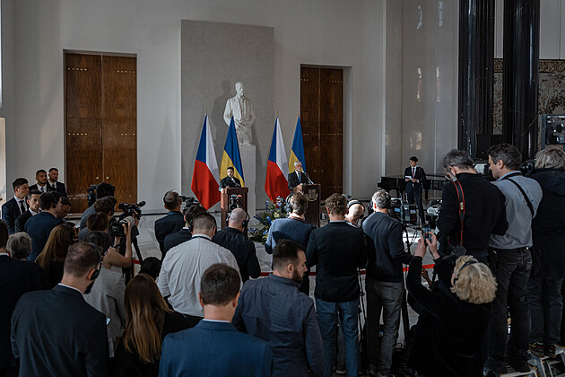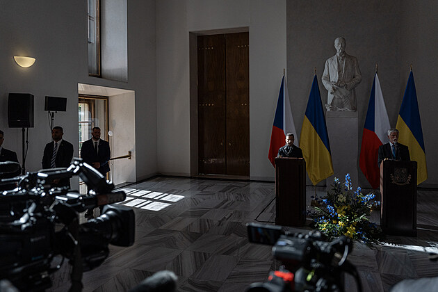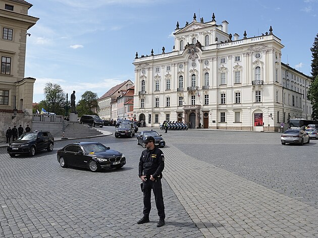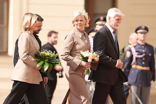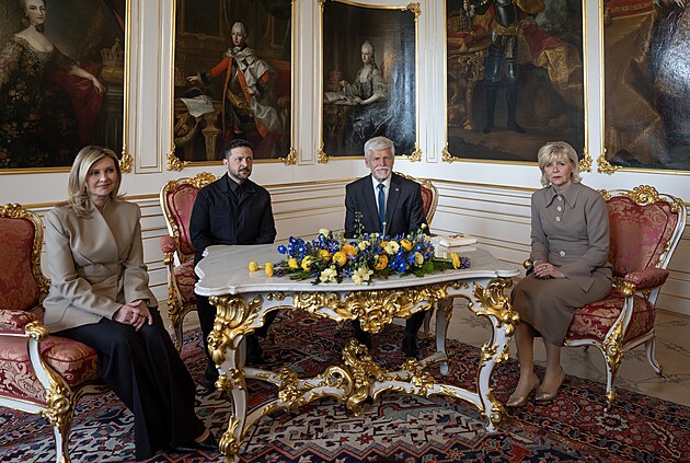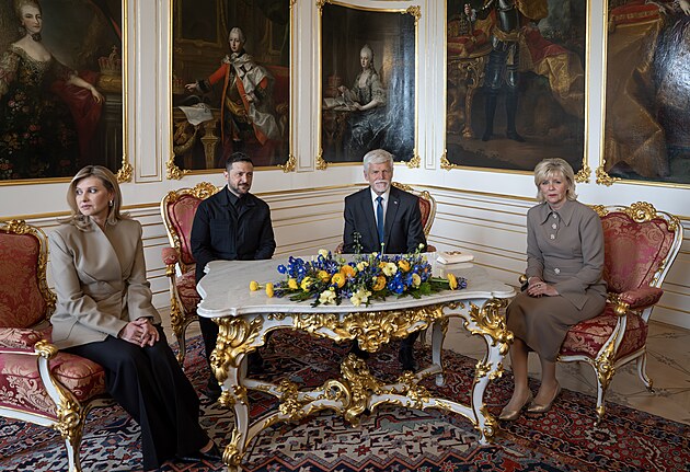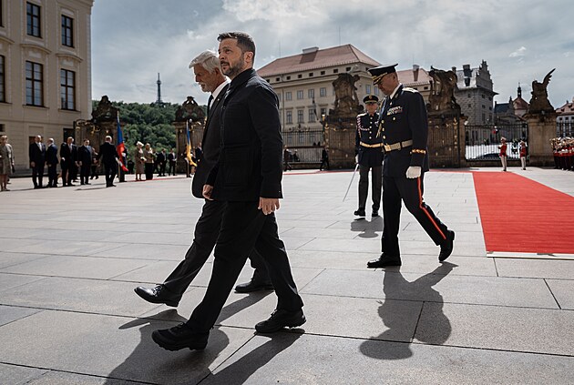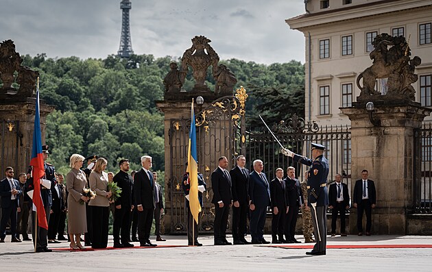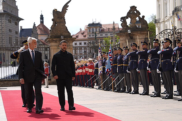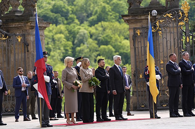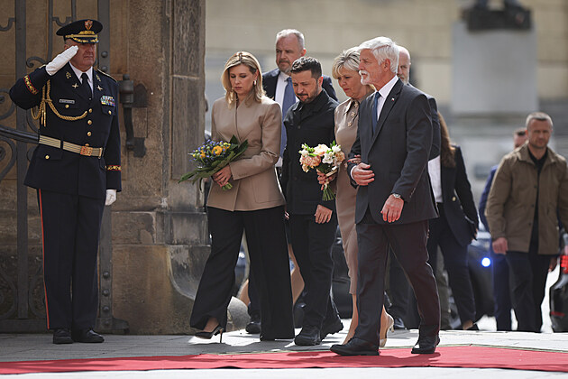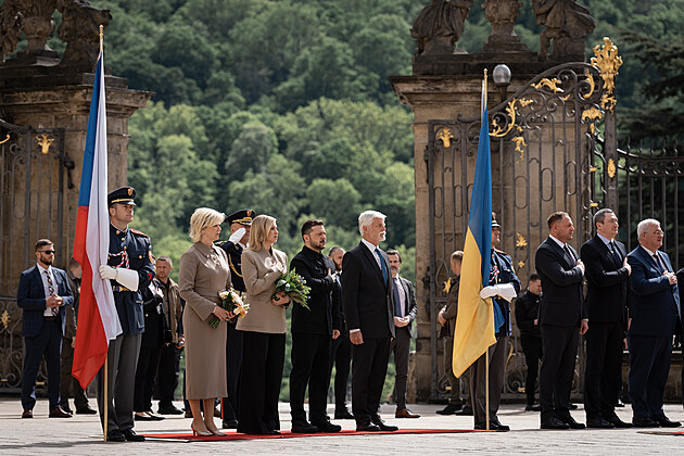 Na prvním hradním nádvoří hrála Hradní stráž hymny obou zemí a atmosféra byla dojemná. Pavel s Pavlovou stáli po boku svých hostů; Zelenskyj s Olenou měli ruce na srdci a na tvářích vážný výraz – přece jen jejich země je ve válce už třetím rokem