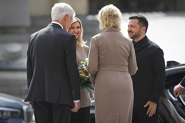 Ukrajinský prezident Volodymyr Zelenskyj je se svou manželkou Olenou na návštěvě Česka. Na Pražském hradě je přivítali jejich protějšky Petr a Eva Pavlovi. (4. května 2025)