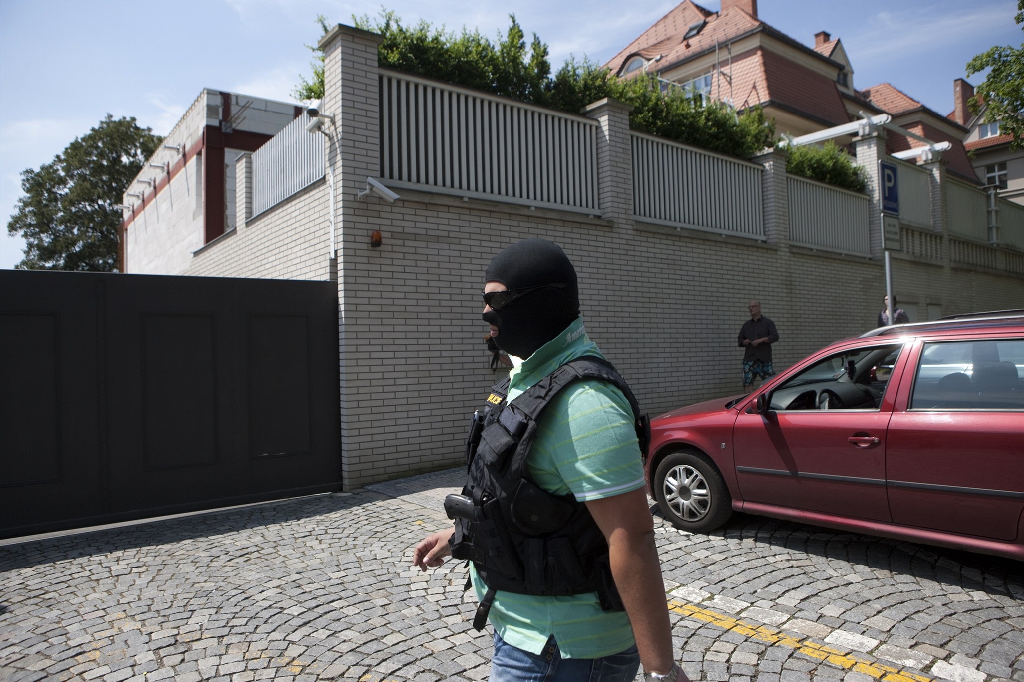 Policista ÚOOZ za mohutnou zdí Rittigovy vily.