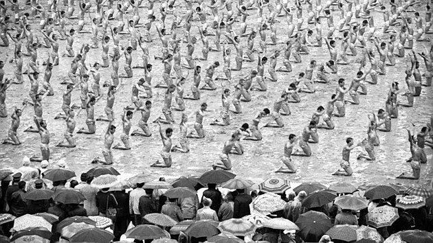 Na samotnou spartakiádu se ale počasí umoudřilo a dobové fotky ukazují cvičení v jasných barvách.