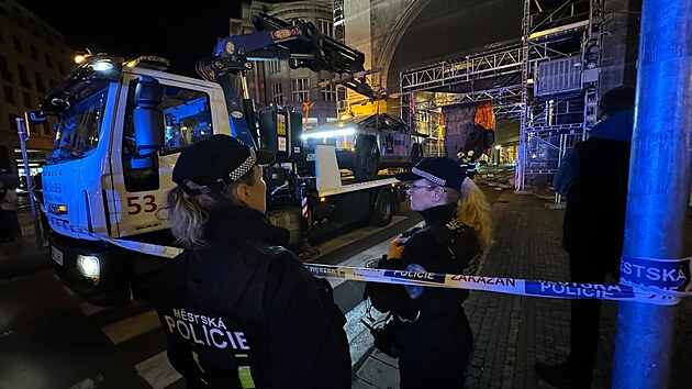 „Restaurátoři v dopoledních hodinách prověřují stav věže a podle prvotních zjištění nebyla nijak poškozena,“ řekl dnes Novinkám.cz předseda představenstva firmy Prague City Tourism (PCT) František Cipro. Škody na lešení podle něj podnik vyčísluje a bude žádat náhradu škody po odtahové službě. „Rozsah poškození lešení však nemá podle lešenářů vliv na statiku a používání lešení,“ doplnil Cipro.