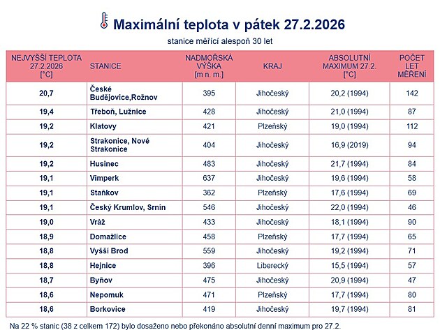 Nejtepleji dnes bylo v Karlovarském, Plzeňském a Jihočeském kraji, v pásu od jižních Čech k podhůří Krkonoš a Orlických hor a také ve Frýdlantském výběžku a výběžcích za Jeseníky na severu Slezska, vyplývá z mapy zveřejněné ČHMÚ. Dnešek často přepisoval rekordy z 27. února 1994, což je i případ Českých Budějovic. Tam dnešní teplota o půl stupně překonala dosavadní právě 32 let starý rekord.