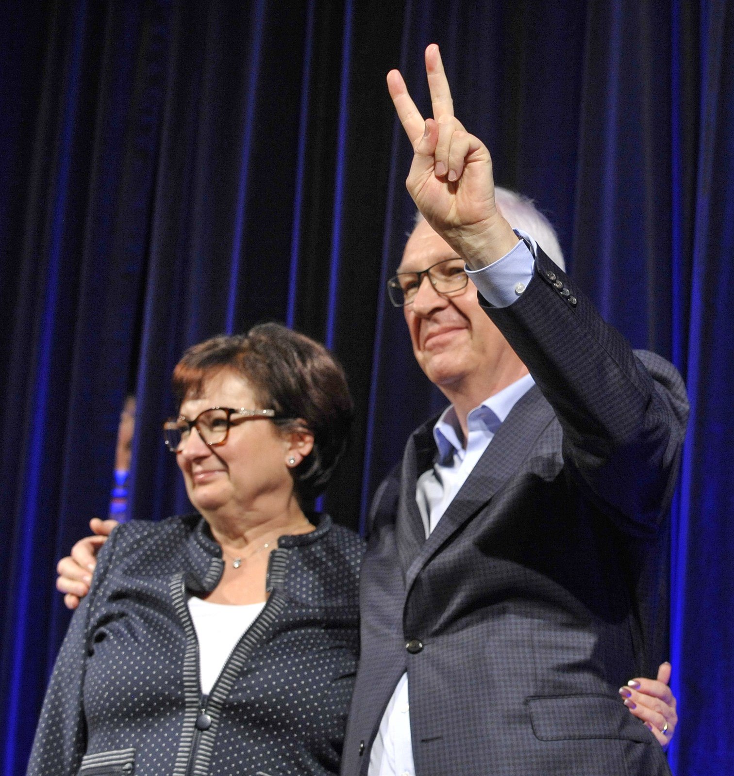 Jiří Drahoš s manželkou na pódiu kulturního centra Semilasso v brněnské čtvrti Královo Pole.