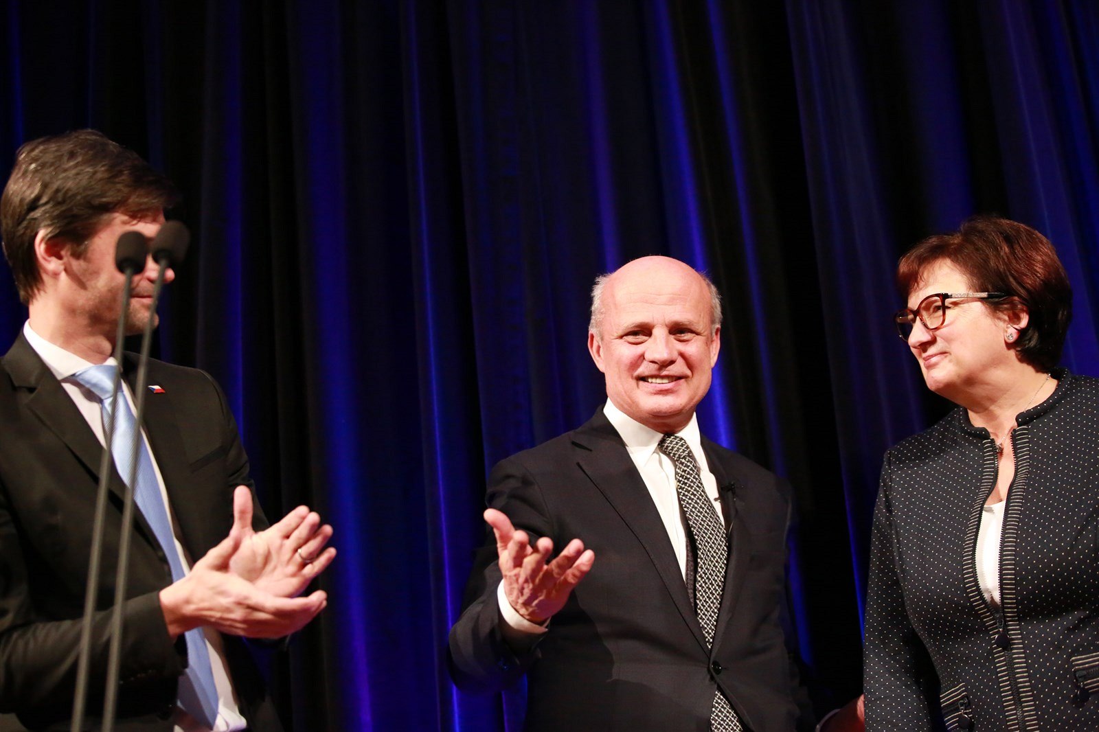 Michal Horáček na pódiu s Evou Drahošovou a Markem Hilšerem. Oba, spolu s Pavlem Fischerem, vyjádřili Drahošovi podporu.