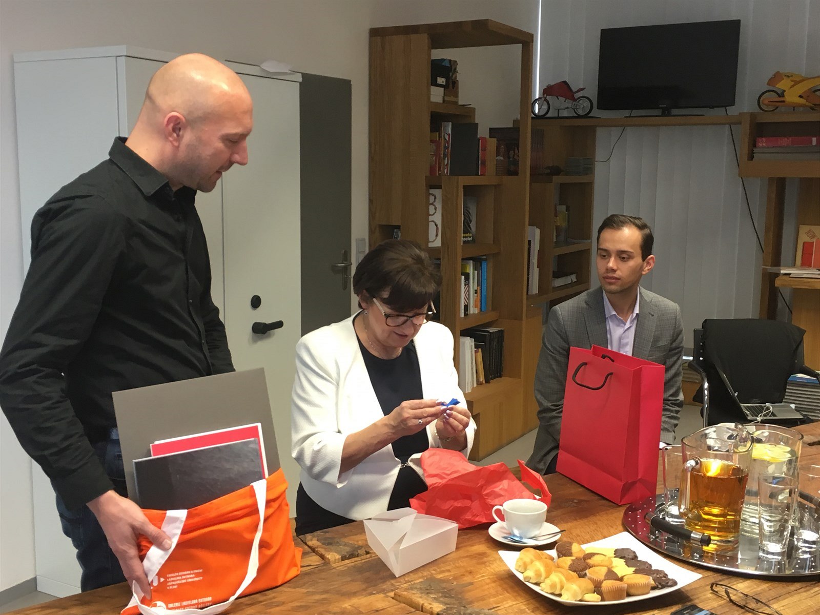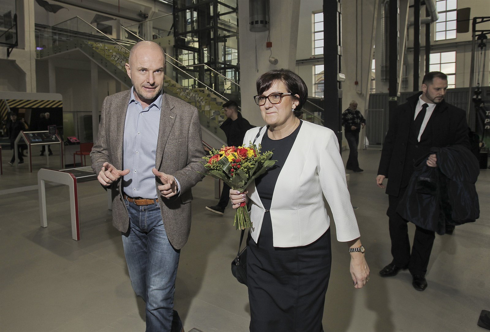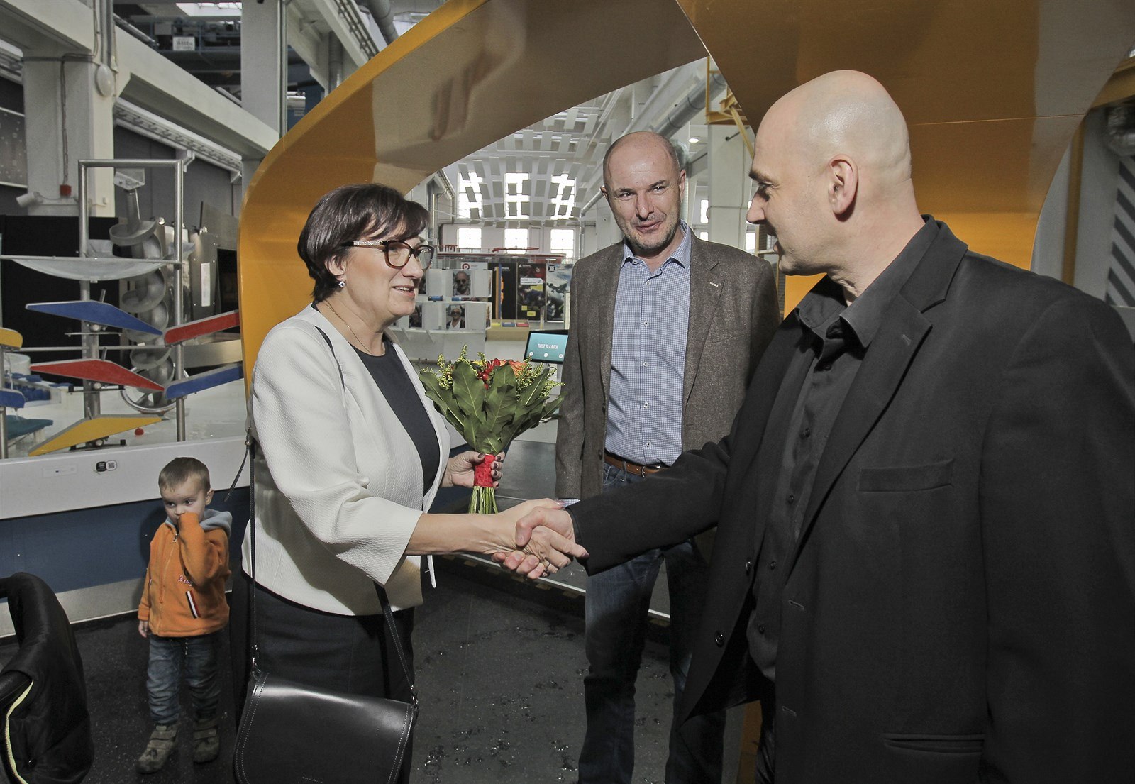 Eva Drahošová se víta s ředitelem Techmanie Vlastimilem Volákem. V pozadí Josef Bernard.