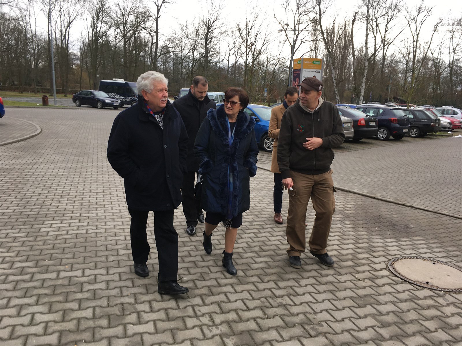 Eva Drahošová přichází do plzeňské zoo. Společnosti ji dělá senátor Václav Chaloupek (vlevo) a Martin Votruba, mluvčí organizace.