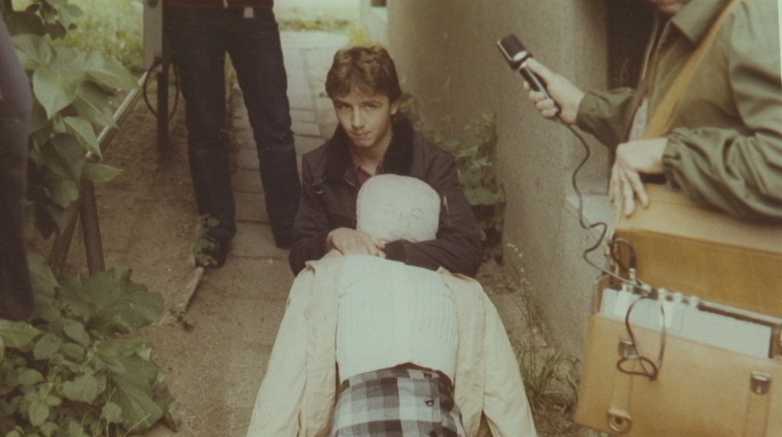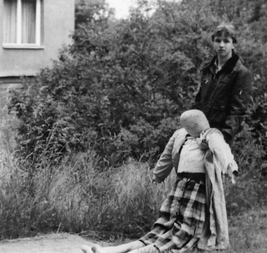 Jiří Straka předvádí manipulaci s tělem Věry F.v pražském Hloubětíně před domem, kde žila.