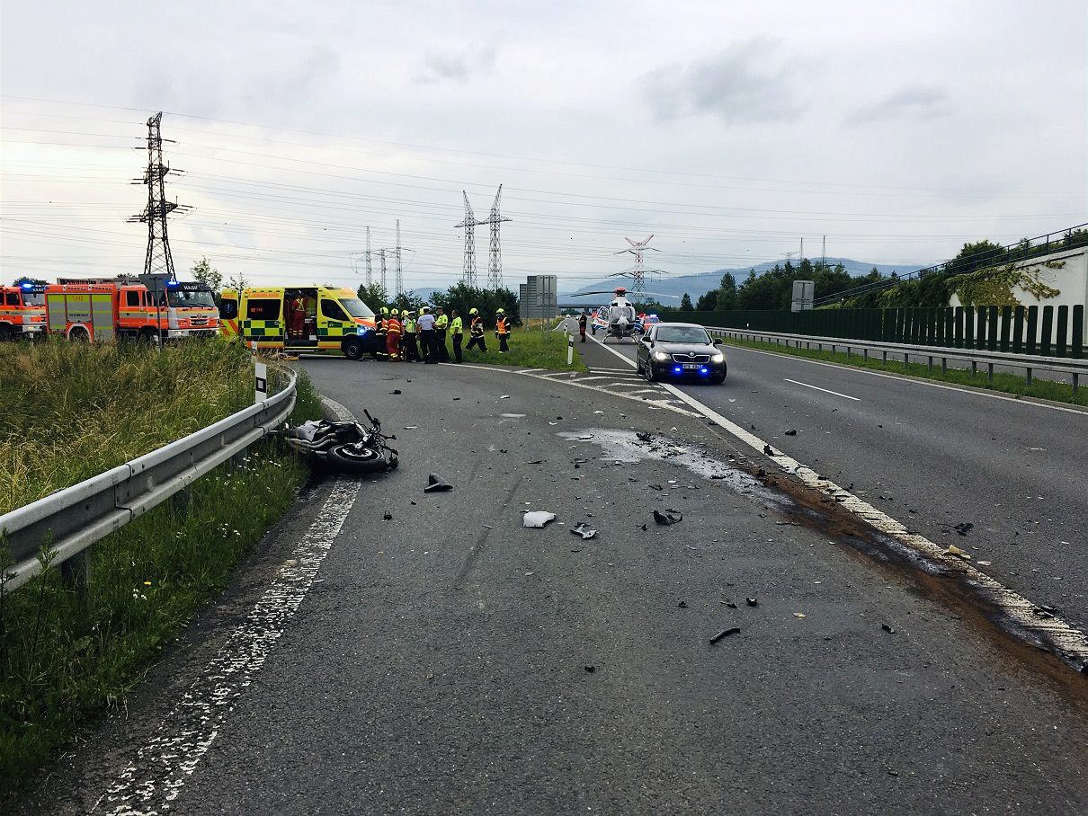 Devětatřicetiletý motocyklista, který se 3. července večer na sjezdu z dálnice D48 v Dobré u Frýdku-Místku srazil se dvěma osobními auty, v nemocnici zemřel. Při nehodě (na snímku) se v jednom autě zranili čtyři lidé a policisté na místě zjistili, že motocyklista měl zakázáno řízení.