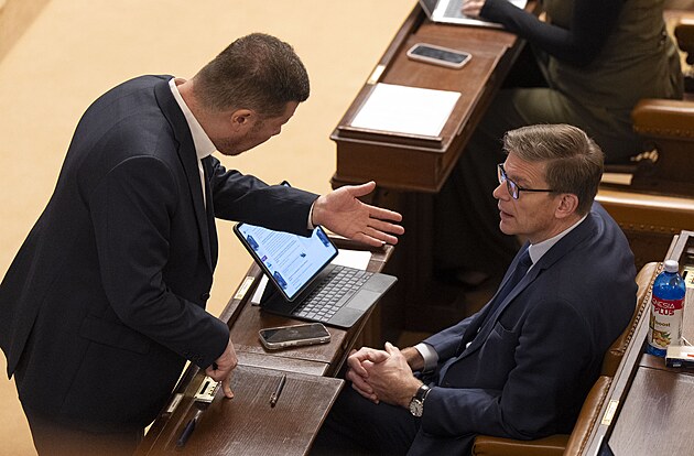 Mimořádná schůze Poslanecké sněmovny. Na snímku Tomio Okamura (SPD) a Martin Kupka (ODS). (29. ledna 2026)