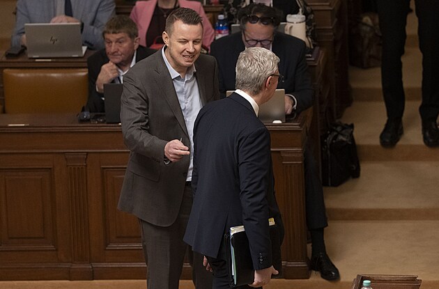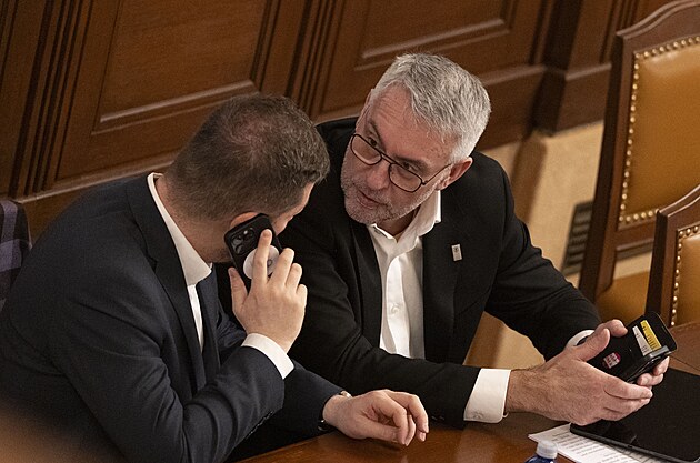 Mimořádná schůze Poslanecké sněmovny. Na snímku Aleš Juchelka (ANO) a Jaroslav Foldyna (SPD). (29. ledna 2026)