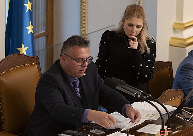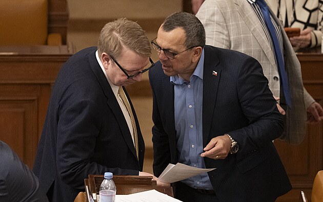 Mimořádná schůze Poslanecké sněmovny. Na snímku Tomio Okamura (SPD) a Lubomír Metnar (ANO). (29. ledna 2026)