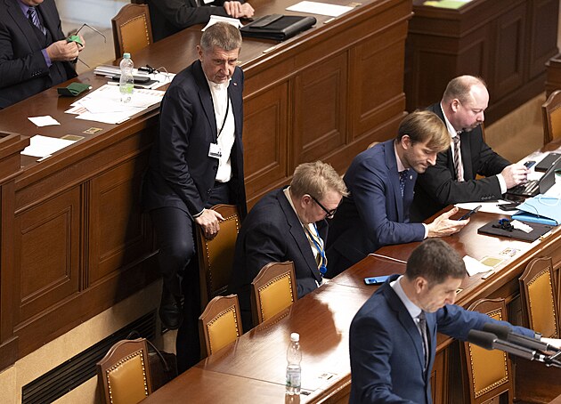 Mimořádná schůze Poslanecké sněmovny. Na snímku Andrej Babiš a Karel Havlíček (ANO). (29. ledna 2026)