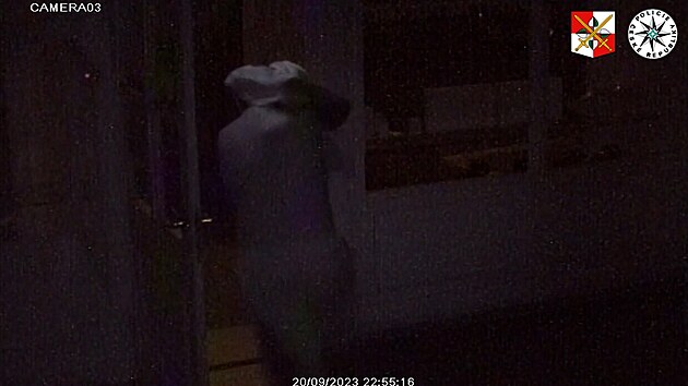 Jeho počínání zachytila bezpečnostní kamera. Na záběrech je vidět, jak muž kope do dveří, než se rozlétnou. Kolem hlavy má omotané tričko, které si následně svléká.