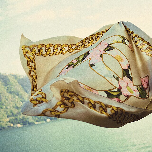 Barevnost nejhlubšího jezera v Evropě, Como, Villy d’Este a jejího okolí odrážejí i tóny kolekce Chanel Cruise 2025/26. Hedvábné šátky značka vyrábí v italské manufaktuře Mantero.