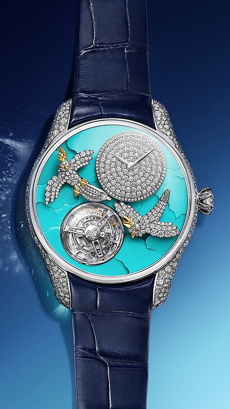 Motiv ptáčka zdobí letošní novinku, navíc nominovanou na prestižní cenu GPHG 2024, Bird on a Flying Tourbillon. Hodinky vynikají krásným číselníkem, pro nějž mistři značky využili intarzii z polodrahokamu tyrkys. Vytvořit číselník ze 16 kousků tyrkysu, tvarem připomínajících obláčky na obloze, zabere 45 hodin práce.