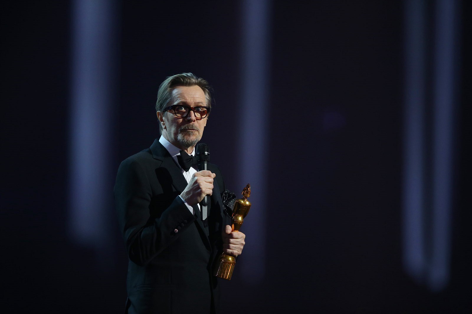 Herec Gary Oldman převzal ve jménu Davida Bowieho cenu pro největší britskou ikonu.
