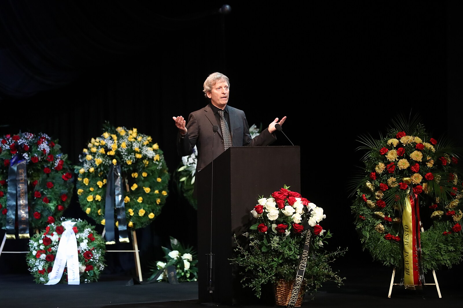 Chvilku po poledni pak samotný smuteční program zahájily archivní nahrávky a vzpomínky na Jana Kačera. Pak si už vzal slovo ředitel první scény Jan Burian. „Jako režisér patřil především divadlu: takřka 170 inscenací, 80 jevištních postav. Režíroval v Curychu, Basileji, Oslu, Záhřebu. Už jako student asistoval v roce 1959 v Národním divadle Alfrédu Radokovi,“ uvedl Burian a dále vzpomněl na Kačerovu výraznou režijní kariéru od Ostravy, přes Činoherní klub až po práci na Vinohradech a v Národním divadle.