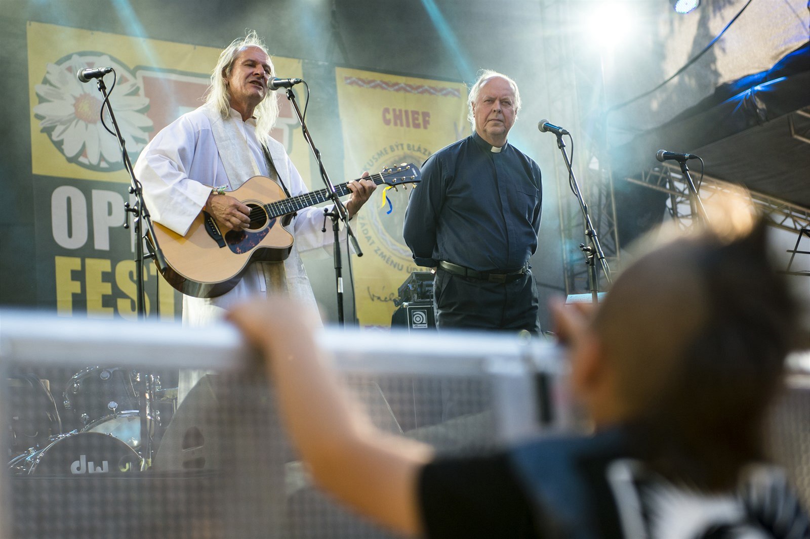 Bohoslužbu vedenou katolickým knězem Ladislavem Heryánem (na snímku vlevo) byl v trutnovském amfiteátru Na Bojišti zahájen 18. srpna hudební festival.