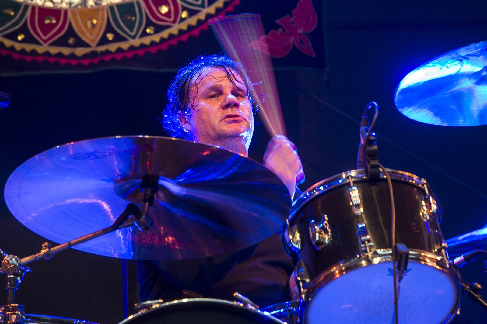 Bubeník Pavel Attel z české skupiny Tichá dohoda vystoupil na trutnovském festivalu 20. srpna.