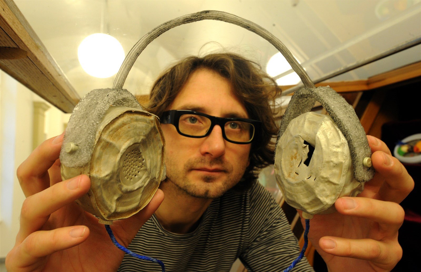 Historik muzea Martin Krsek ukazuje sluchátka z kovového odpadu.