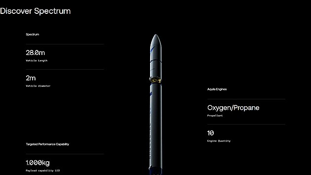 Raketa Spectrum měří 28 metrů na délku a dva metry v průměru. Podle serveru Space.com tak jde o spíše skromnější kompromis mezi raketou Electron americko-novozélandské společnosti Rocket Lab, která má 17 metrů, a nosičem Falcon 9 od americké firmy SpaceX. Ta měří 70 metrů.