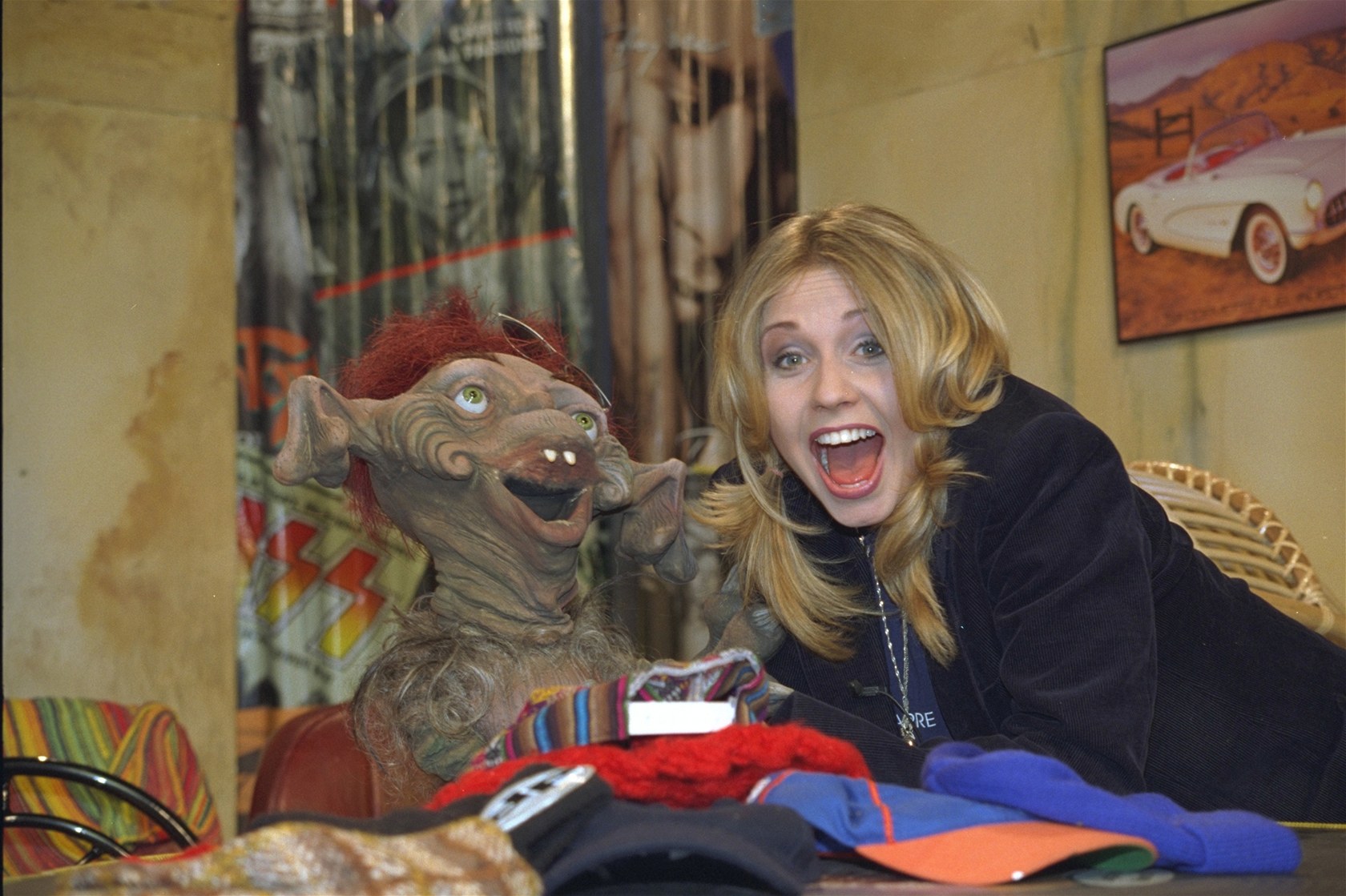 Zpěvačka Nikola Šobichová z kapely Holki a moderátor Leoš Mareš v pořadu Eso (2003)