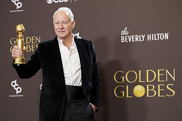 Stellan Skarsgard, vítěz ceny za nejlepší mužský herecký výkon ve vedlejší roli ve filmu Citová hodnota (Sentimental Value), na předávání Zlatých glóbů. (11. ledna 2026)