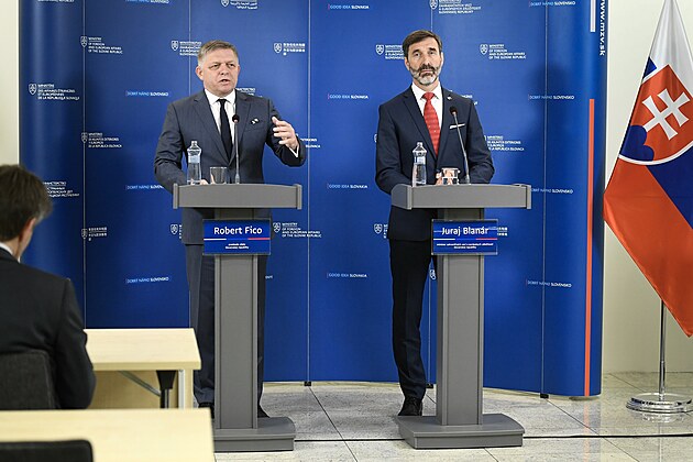 Slovenský premiér Robert Fico a ministr zahraničí Juraj Blanár na tiskové konferenci k migračnímu paktu EU (16. dubna 2024)
