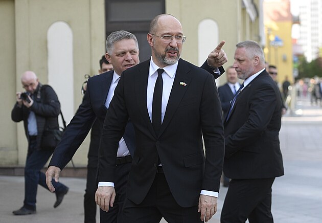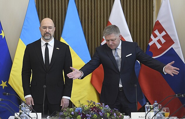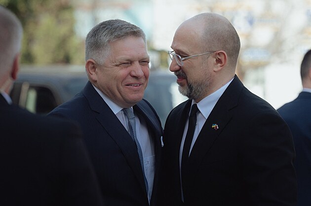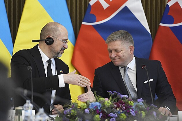 Ve slovenských Michalovcích se konalo společné zasedání slovenské a ukrajinské vlády. Na snímku jsou premiéři Robert Fico a Denys myhal. (11. dubna 2024)