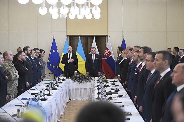 Ve slovenských Michalovcích se konalo společné zasedání slovenské a ukrajinské vlády. V čele stolu stojí premiéři Robert Fico a Denys myhal. (11. dubna 2024)