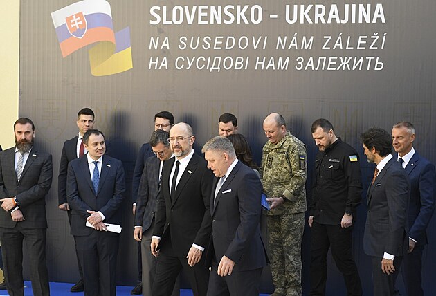 Ve slovenských Michalovcích se konalo společné zasedání slovenské a ukrajinské vlády. V popředí stojí premiéři Robert Fico a Denys myhal. (11. dubna 2024)