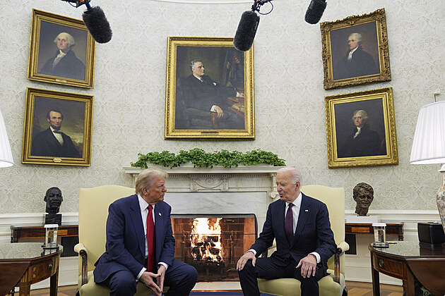 Prezident Joe Biden se setkává s nově zvoleným prezidentem Donaldem Trumpem v Oválné pracovně Bílého domu. (13. listopadu 2024)