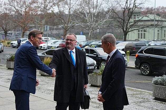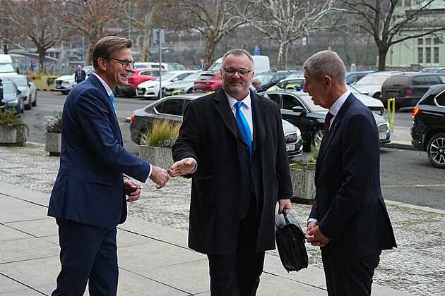 Andrej Babiš (ANO) s bývalým ministrem dopravy Martinem Kupkou (vlevo) a nově jmenovaným ministrem Ivanem Bednárikem (SPD). (15. prosince 2025)