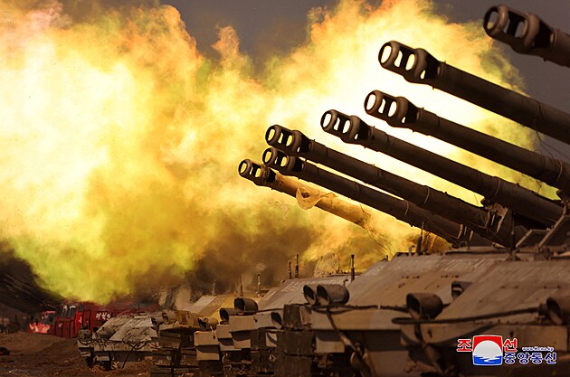 KLDR v reakci na společné cvičení Jižní Koreje a Spojených států ve čtvrtek předvedla své dělostřelectvo. Palbě přihlížel i vůdce Kim Čong-un. (7. března 2024)