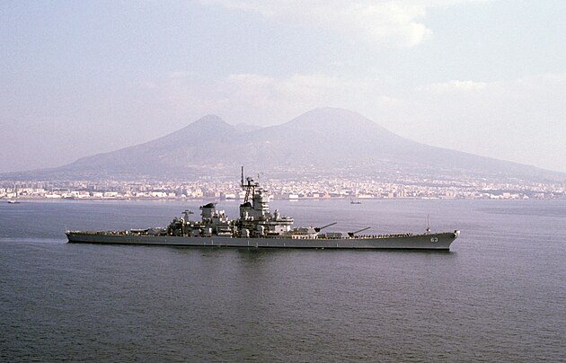 Bitevní loď USS Missouri s Vesuvem na pozadí
