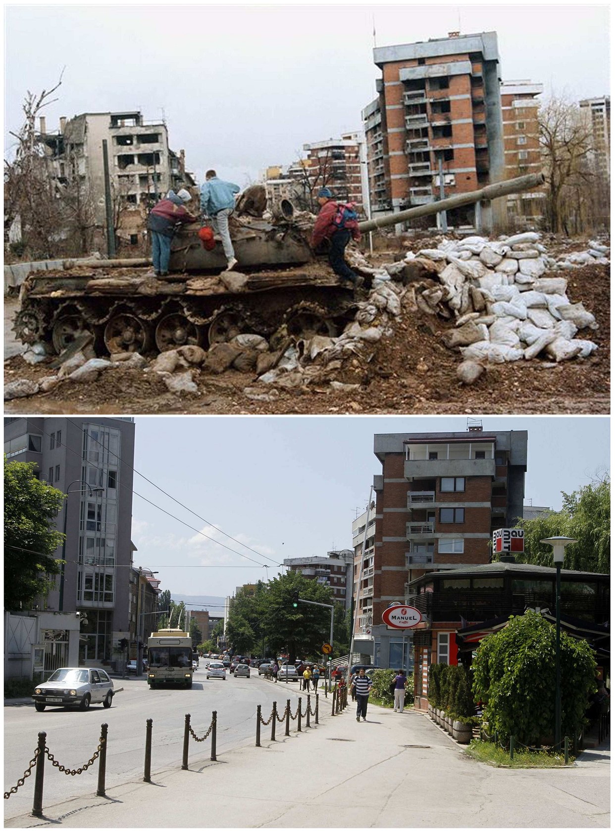 Šestnáct let po konci války napětí mezi Chorvaty, Bosňáky a Srby stále doutná. Na snímku obyvatelé rozstřílené čtvrti Kovačiči v únoru 1996 lezou po opuštěném tanku. Dole pohled na stejné místo nyní.