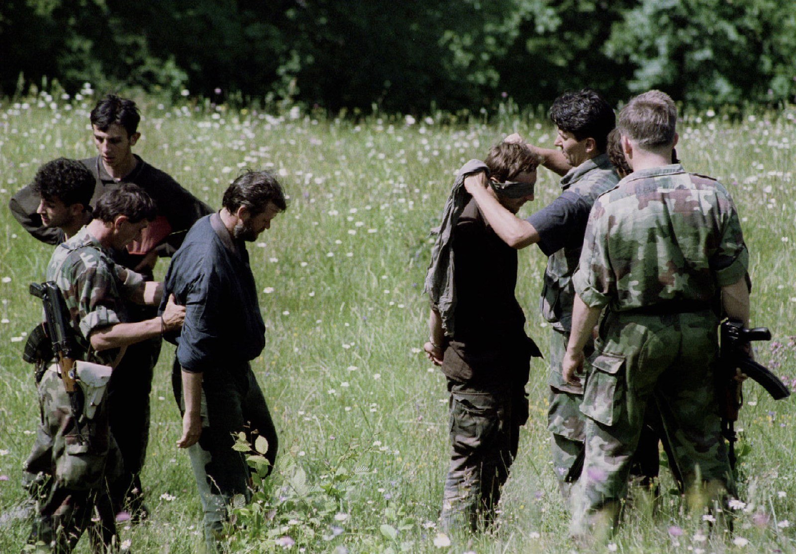 Bosenští Chorvaté v Konjiči zavazují oči muslimským zajatcům předtím, než je předají bosenským Srbům k výslechu (14. června 1993).