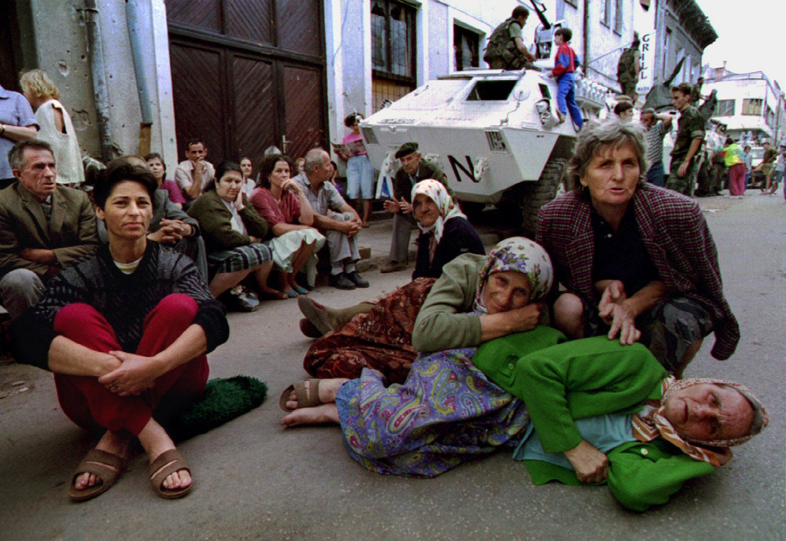 Lidé schovávající se u obrněnců mírových jednotek (31. srpna 1993).