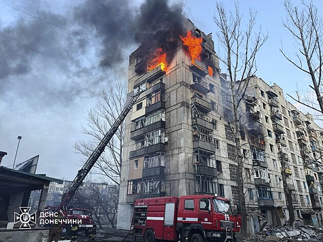 Na snímku poskytnutém ukrajinskou záchrannou službou hasiči hasí požár poškozené budovy po ruském úderu v Kostťntynivce v Doněcké oblasti. (13. března 2025)