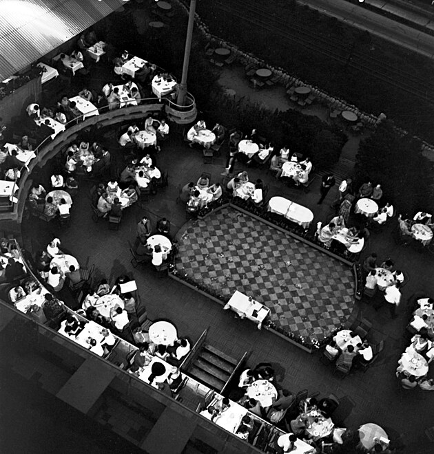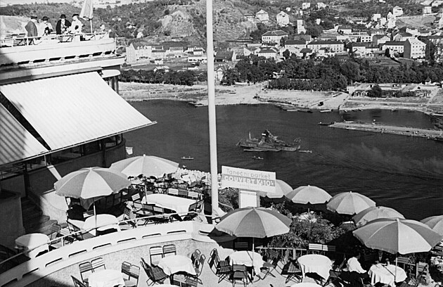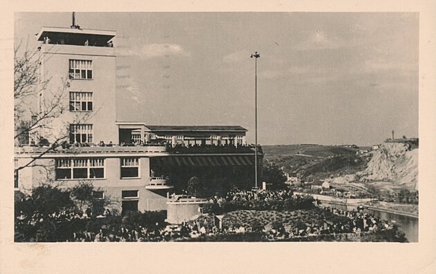 Barrandovské terasy. Do zahradní restaurace se vešly až tři tisíce hostí. Orchestr R. A. Dvorského hrál do sedmé večer na terasách a pak se přemisťoval do baru Trilobit, přistavěného k terasám v roce 1937.