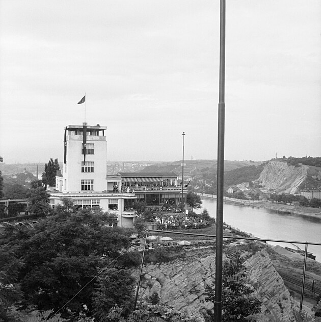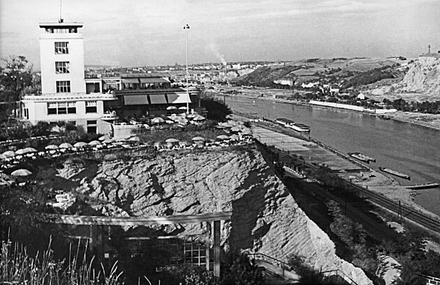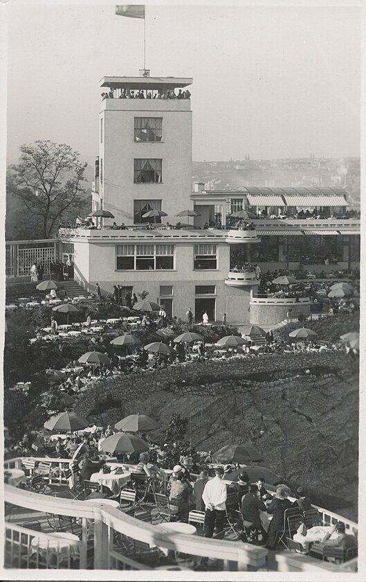 Funkcionalistická stavba poutala pozornost vyhlídkovou věží, uvnitř se nacházela francouzská restaurace, ze tří stran prosklená, a dále kavárna se zastřešenou terasou a komplexem dalších otevřených teras, které přirozeně kopírovaly zvlněný okraj barrandovské skály. Snímek je z roku 1942, kdy si terasy oblíbili nacisté.