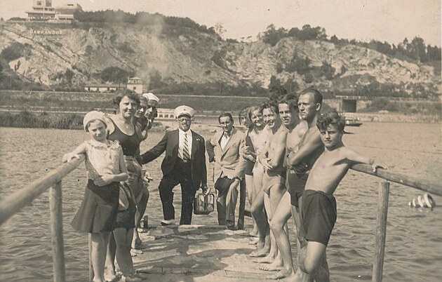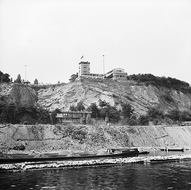 Pohled přes Vltavu na Barrandovské terasy v roce 1932. Terasy nechal postavit Václav Havel starší. Při návštěvě San Franciska ho nadchla restaurace na útesu nad Tichým oceánem, a něco podobného chtěl postavit i v Praze. Otec budoucího prezidenta tedy zakoupil ve 20. letech skalnatý úhor tehdy za Prahou a zbudoval tu vilovou kolonii. A k ní chtěl připojit jakýsi zájezdní hostinec na barrandovské skále. Projekt svěřil architektovi Maxi Urbanovi. Měl tu vybudovat komplex, jež pojme tisíce lidí a zároveň bude v provozu po celý rok.