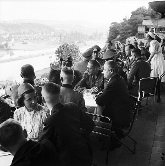 Státní tajemník v říšském ministerstvu lidové osvěty a propagace Leopold Gutterer v doprovodu státního tajemníka K.H.Franka a vedoucího kulturně-politického oddělení v úřadě říšského protektora Martina Wolfa mezi raněnými vojáky v restauraci Barrandov v Praze v červenci 1942.