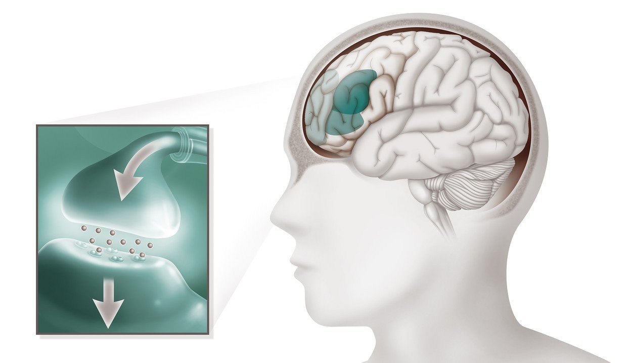 Ilustrace procesu ADHD. Mozkové oblasti umístěné v čelním laloku, které jsou zodpovědné za pozornost, organizační schopnosti (tmavě zelená oblast) a emoční reakce (světle zelená oblast) jsou abnormálně aktivní nebo mají u takto nemocných lidí specifickou anatomii.