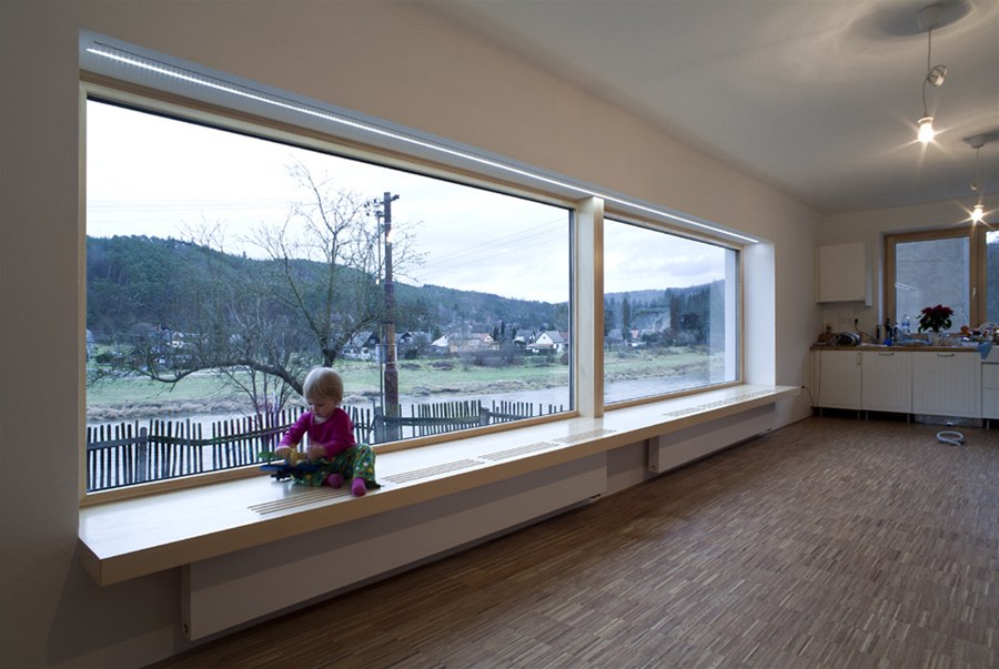 Dominantou domu je okno, díky kterému se dům otvírá do krajiny.