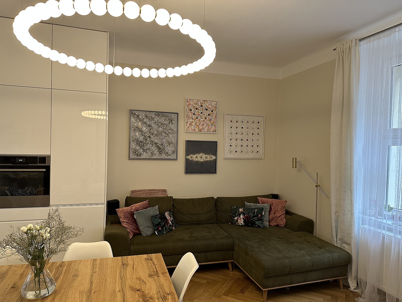 Rozkládací pohovka a skleněný lustr