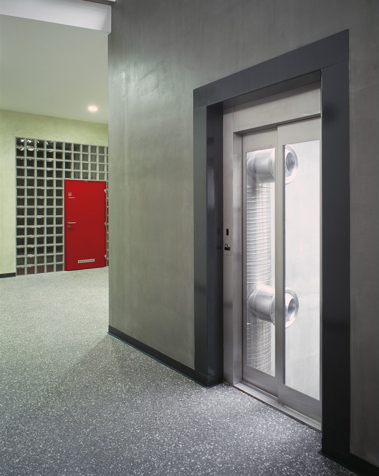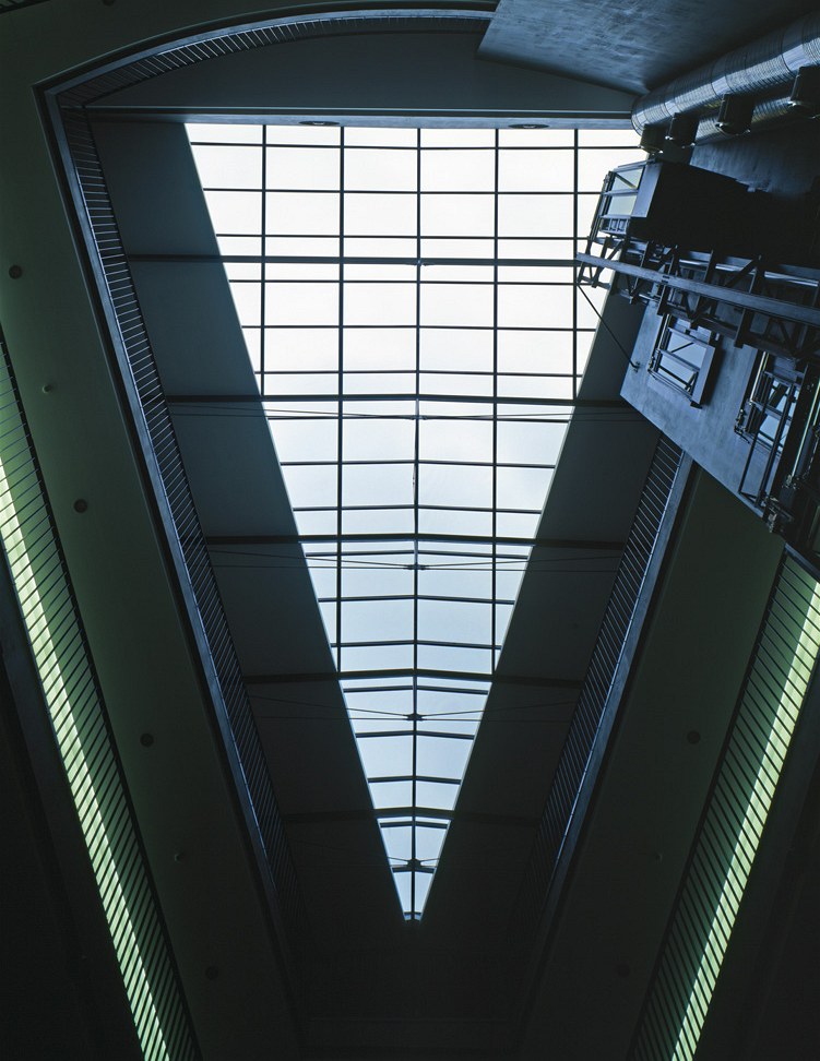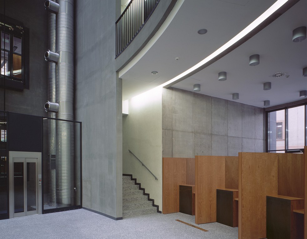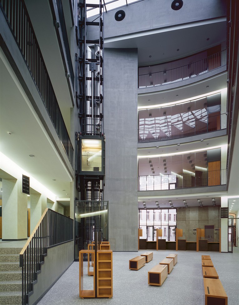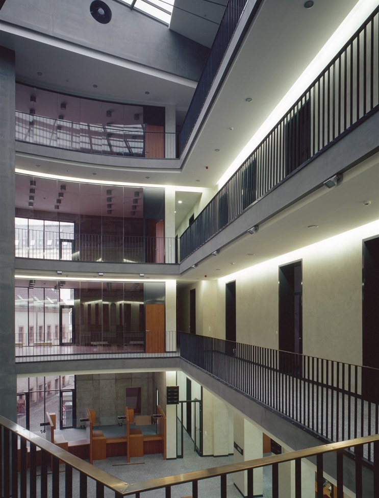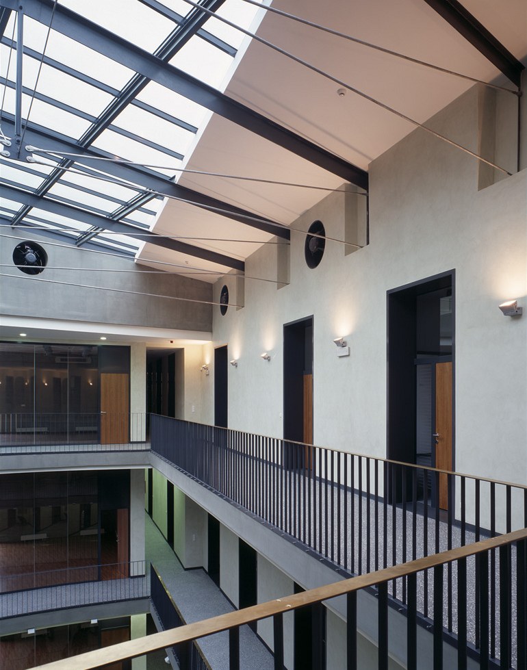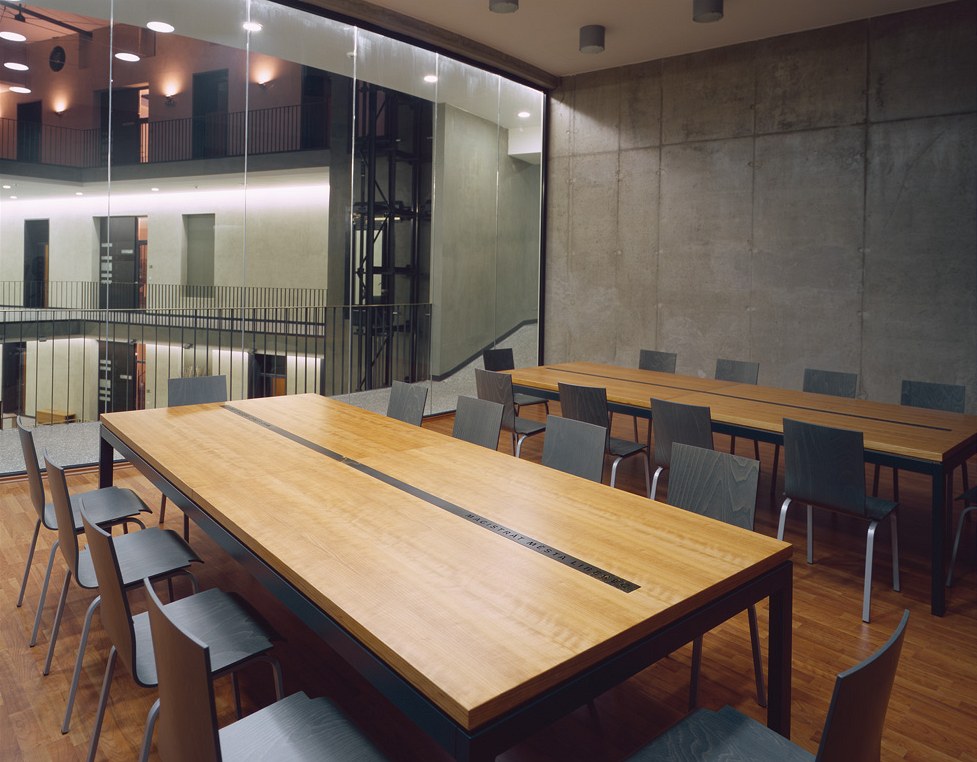 Zasedací místnosti prosklené na obou stranách pomáhají přisvětlit hlavní halu, která má i stropní světlík.