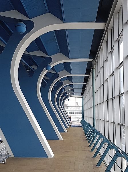 Modrá a bílá. Střídmý a dobře prosvětlený interiér plavecké haly, postavené v letech 1958–1965 dle projektu Richarda Ferdinanda Podzemného, působí velmi příjemně, je laděn modro-bíle.