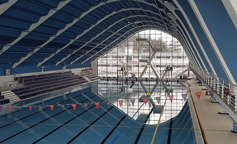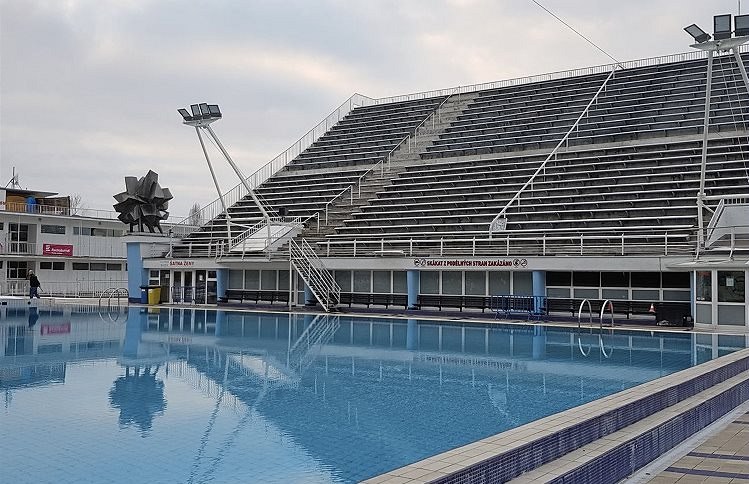 Tribuna na střeše haly s venkovním bazénem a plastiko