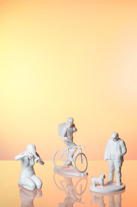 Plastiky a moje další práce jsou součástí mého osobního prostoru, domova. Paradoxně to ale nejsou jen ty povedené kousky... Některé mi tak připomínají moji hloupost a technologickou nevědomost. Ale i tak je mám moc ráda. Například v kabinetu máme vedle lahve Campari opřenou nachýlenou sochu Kurýra z kolekce Alegorie Covidu. Vypadá to docela vtipně, jako opilý cyklista. Nebo na komodě mám řadu asi deseti sošek Jógy, občas možná podvědomý „daily reminder“, že bych měla myslet i na své fyzické zdraví a jít si zaběhat nebo zabruslit.